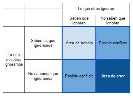 Existe toda una gama de posibilidades de interacción entre actores preocupados por un problema determinado a la hora de intentar resolver el mismo partiendo de las ignorancias existentes al interior del equipo o grupo responsable de su solución, como se muestra en la imagen:
